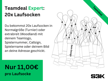 Mit dem Teamdeal Expert erhältst du diese hochwertigen Custom Paintball Laufsocken zu einem unschlagbaren Preis von nur 11,00 € pro Laufsocke. Der Preis deckt alle Design-, Material- und Druckkosten ab, es kommen nur die Versandkosten hinzu. Auf Wunsch kannst du auch weitere Extras zu deinem Paket hinzufügen, um deinen Team-Look zu perfektionieren.