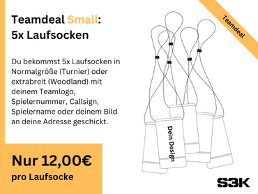 Mit dem Teamdeal Small erhältst du 5 individuell gestaltete Custom Paintball Laufsocken. Wähle zwischen Normalgröße (Turnier) und extrabreit (Woodland). Jede Laufsocke kann mit deinem Teamlogo, Spielernummer, Callsign, Spielernamen oder einem Bild bedruckt werden.